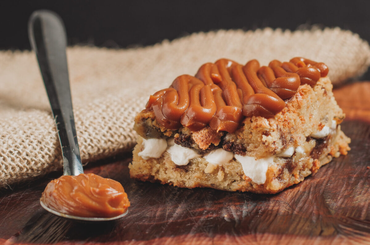 Brownie exclusivo branco (white and black) com cobertura de doce de leite caseiro e recheio de creamcheese.